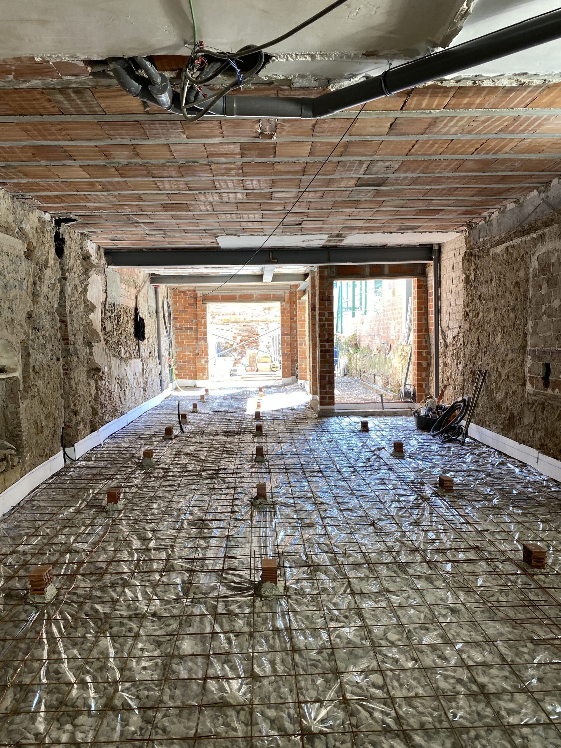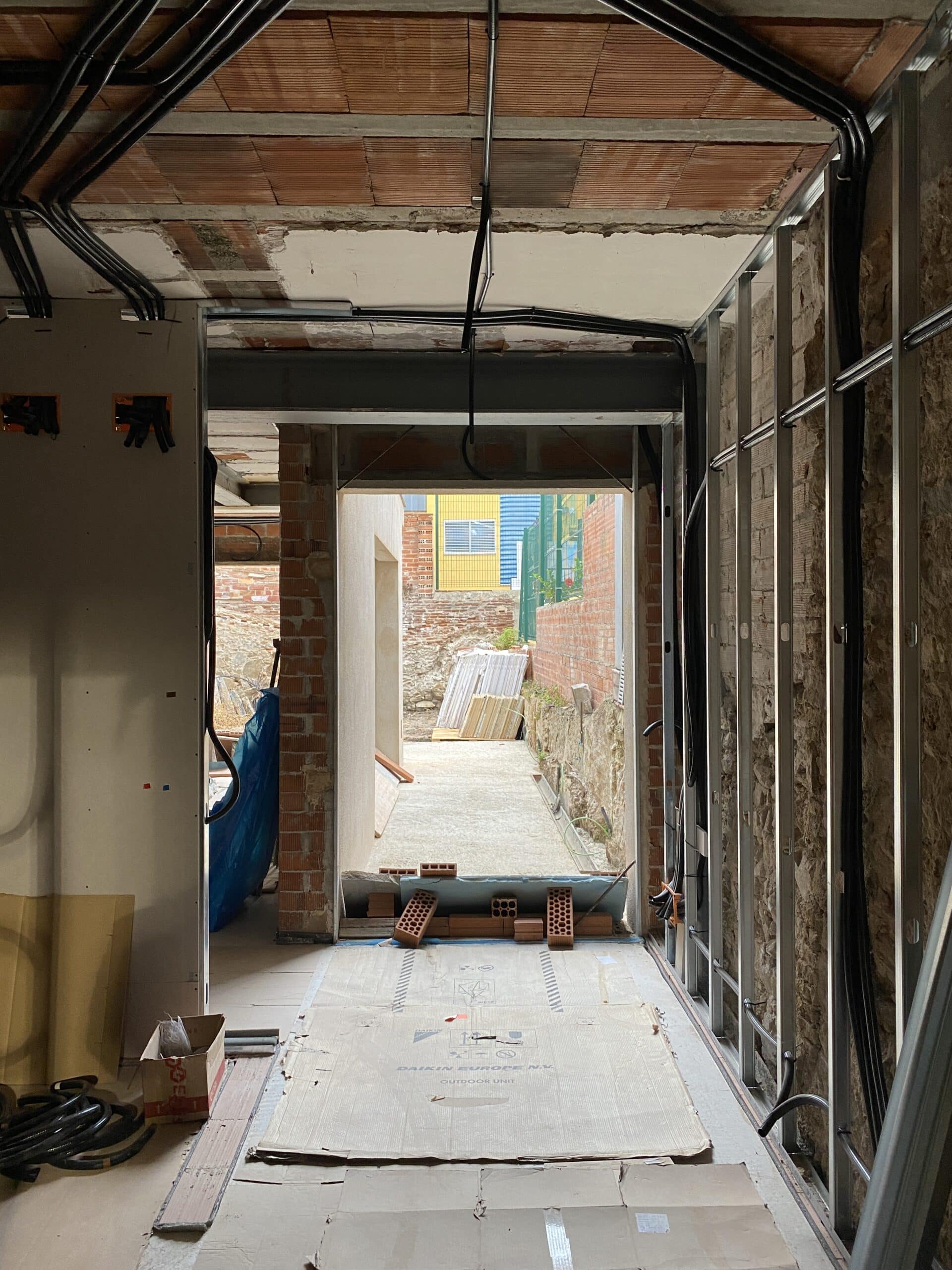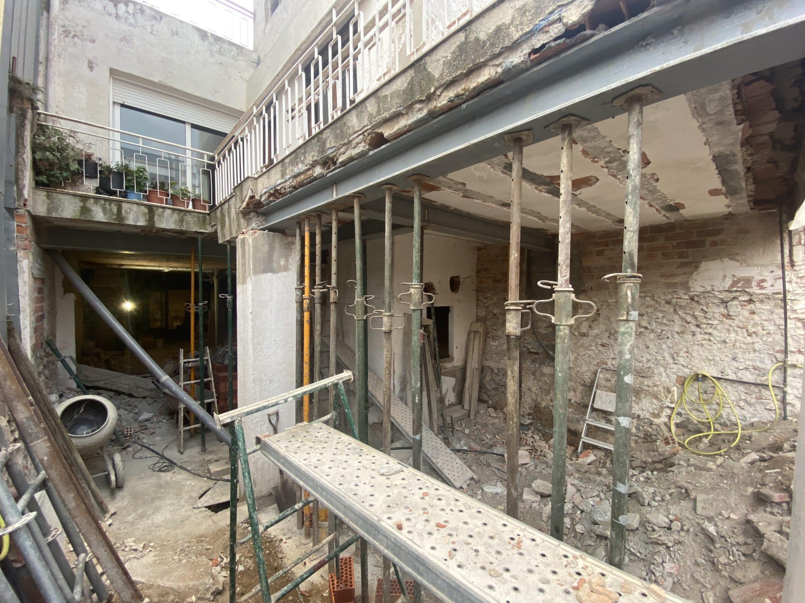 La intervenció es concentra en la planta baixa, que es reconverteix en un habitatge amb accés independent. El nou habitatge incorpora tres habitacions, un vestidor, dos banys i una àrea d’estar-menjador-cuina directament vinculada al pati. La inclusió d’una galeria que serveix dues habitacions permet encabir aquest programa ampli en una finca amb només quatre metres d’ample de façana.