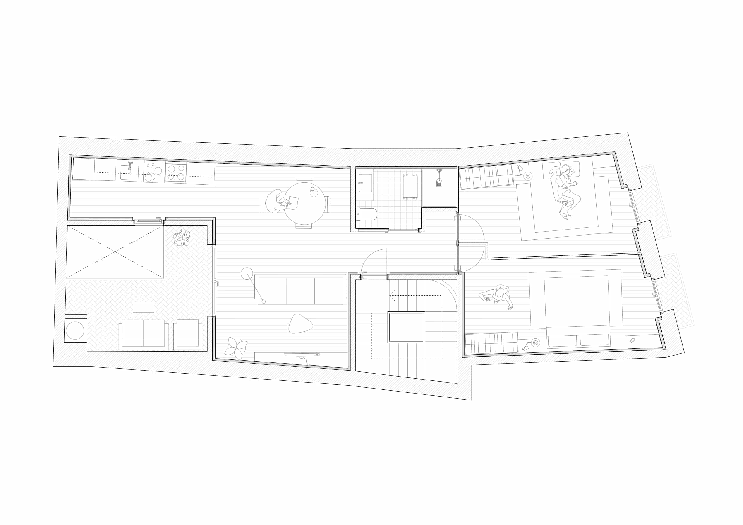L’objectiu era recuperar l’ús residencial original, mantenint al màxim la configuració de l’habitatge i respectant els elements protegits. L’estratègia ha estat quirúrgica: les habitacions s’han conservat, i la intervenció es concentra a la façana interior, on s’ha obert un únic espai per ubicar l’estar-menjador-cuina.