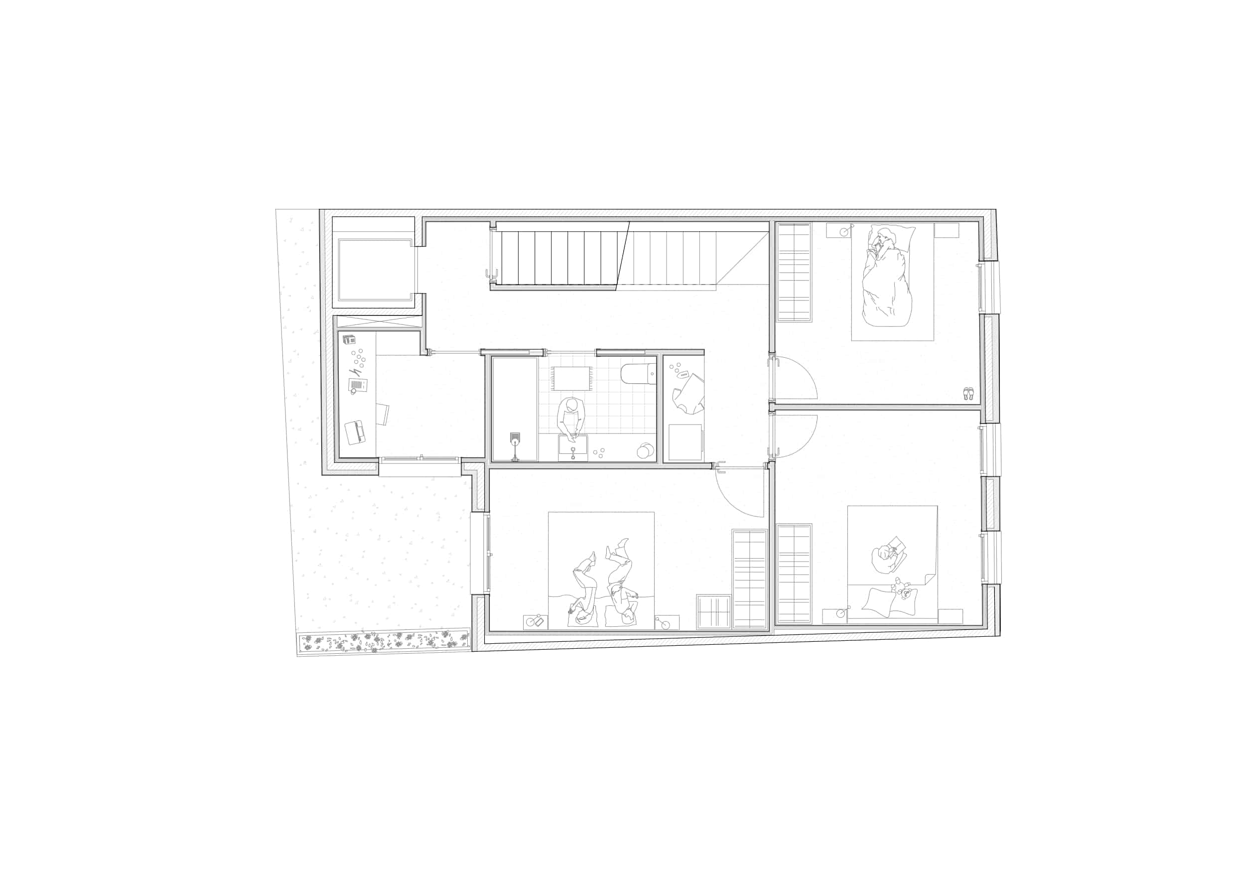 La proposta parteix d’una decisió valenta: invertir el programa clàssic. La planta baixa es destina a aparcament i accés; la primera planta concentra la zona de nit amb tres habitacions, un estudi i un bany; i la segona planta es reserva per a la zona de dia, oberta i lluminosa, amb sala d’estar, menjador i cuina vinculats a una terrassa. Finalment, la coberta es transforma en un jardí, aportant l’espai exterior que la parcel·la no permetia en planta baixa.