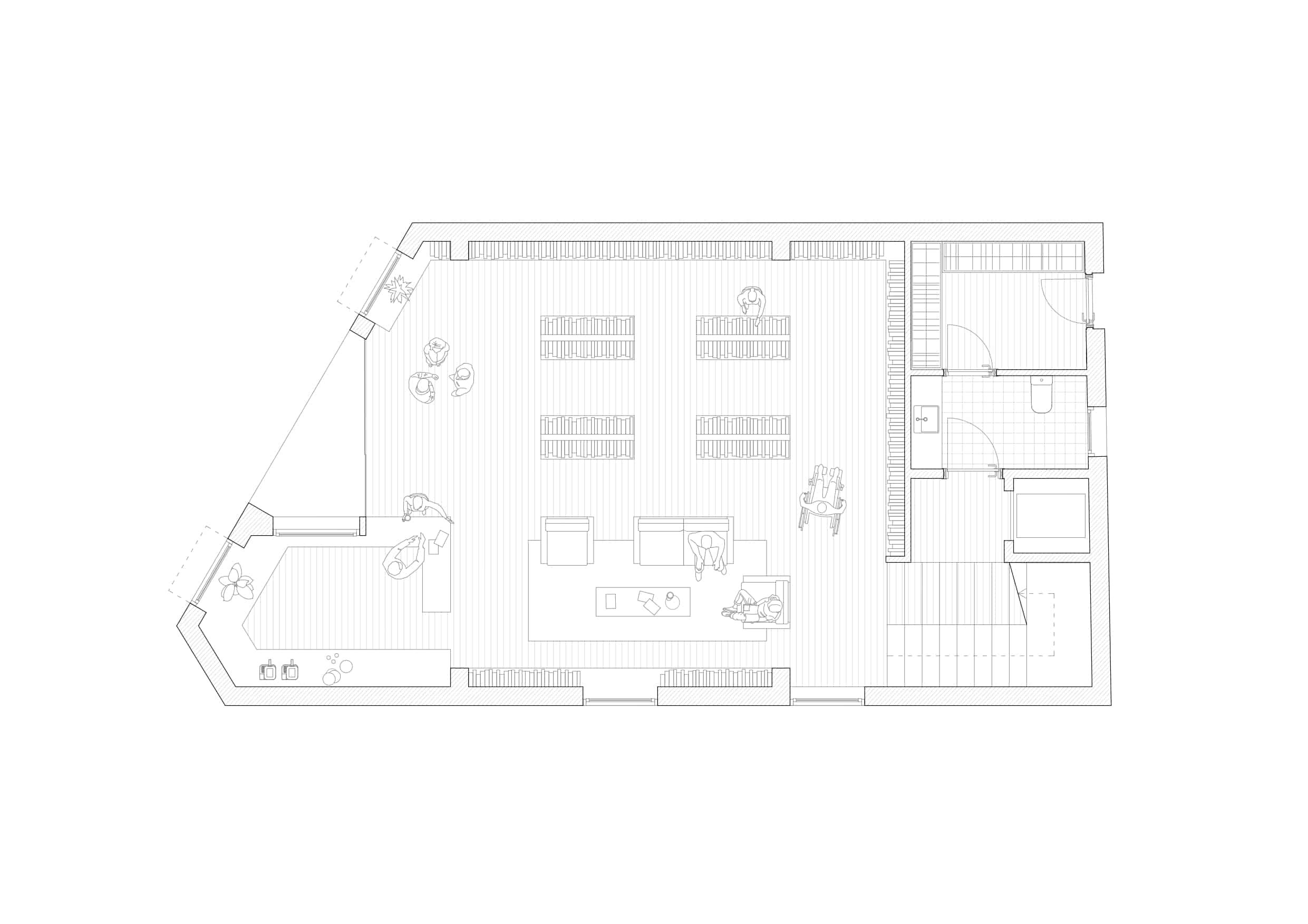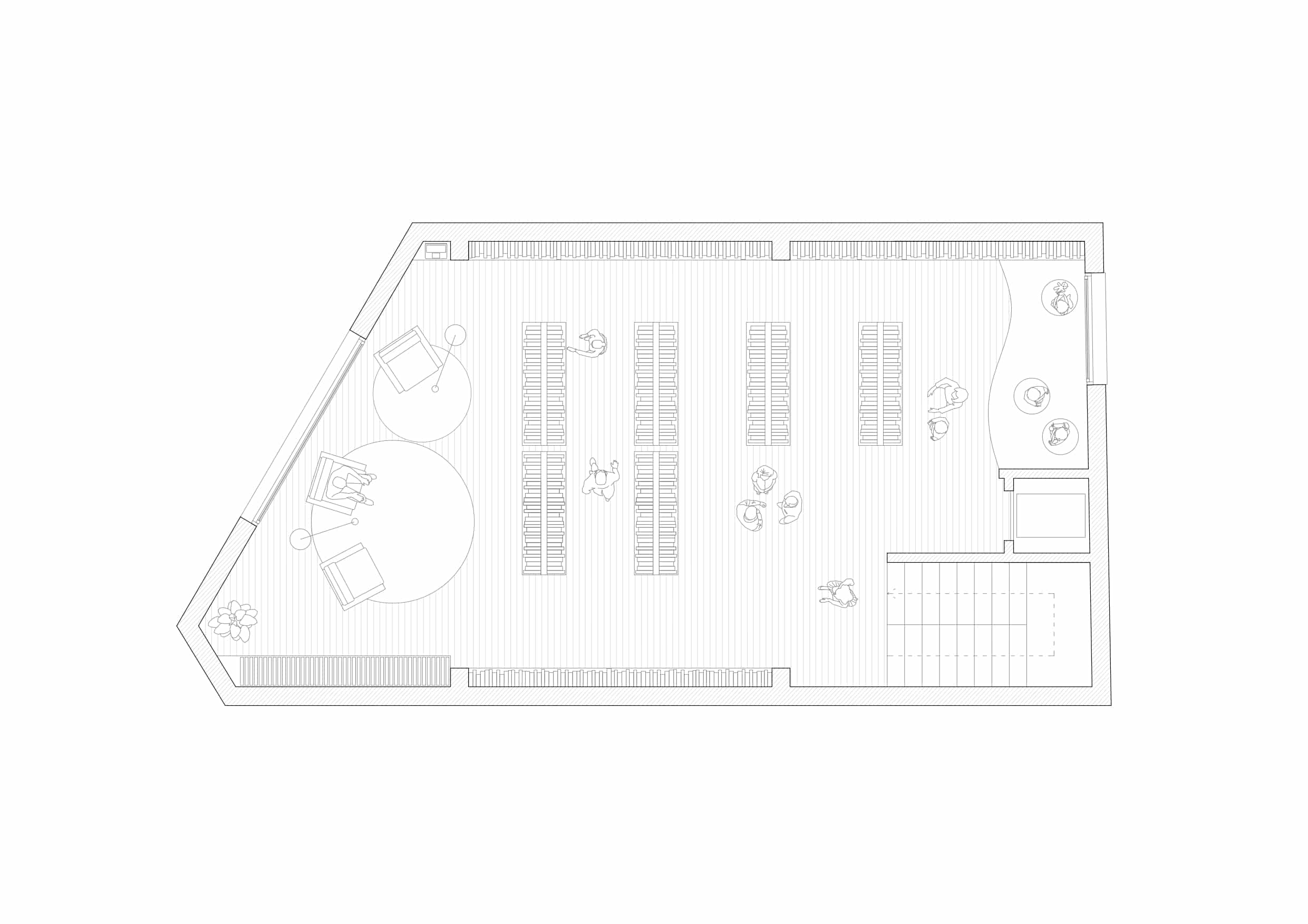 La proposta arquitectònica respon a aquest objectiu ampliant el programa amb espais complementaris: una cafeteria, una espai polivalent per acollir clubs de lectura, col·loquis o presentacions, i un àmbit infantil. Tot plegat converteix la llibreria en un lloc per estar-s’hi, compartir i viure la lectura des de diferents formats.